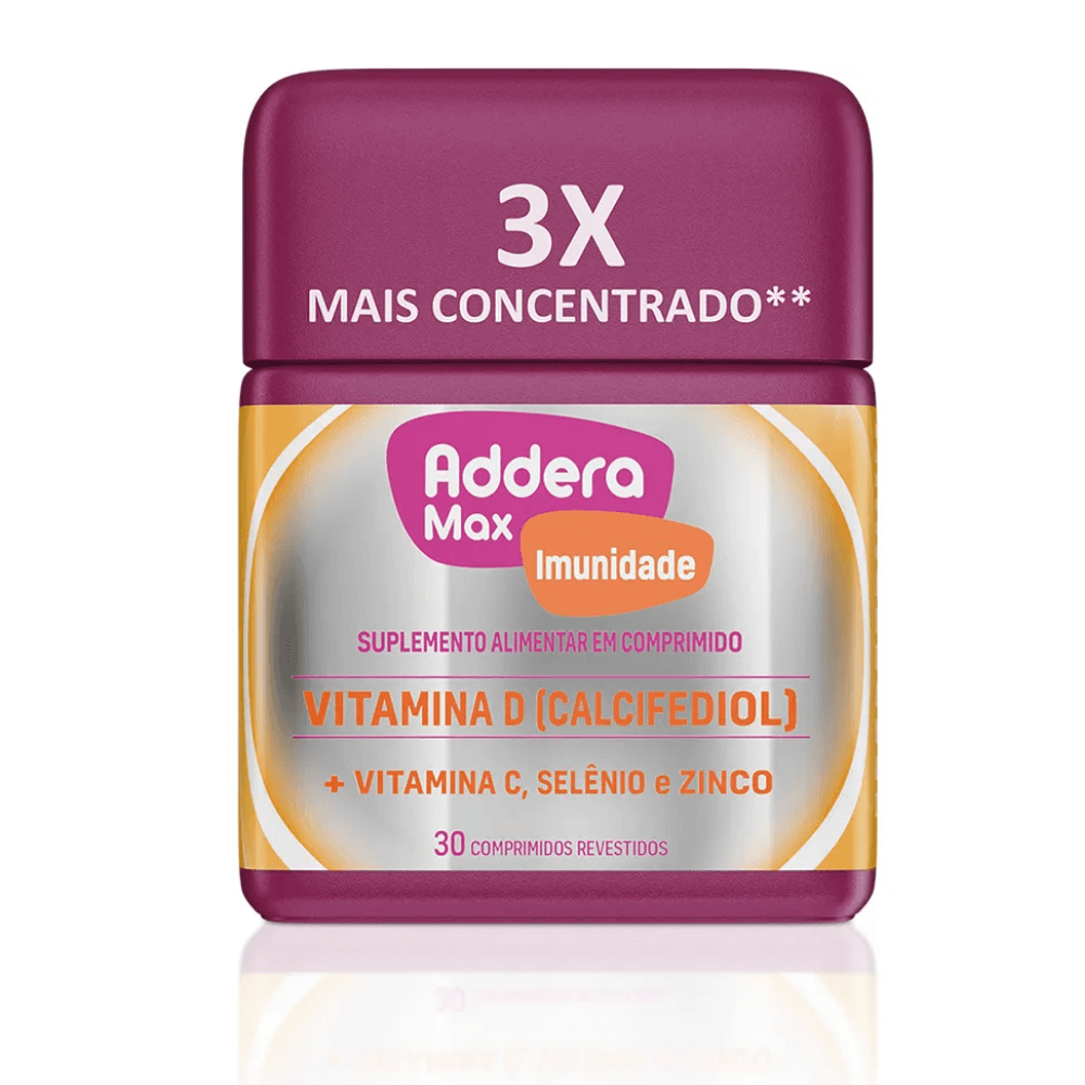 Addera Max + Imunidade é um suplemento nutricional indicado para fortalecer o sistema imunológico. Seu uso contribui para a saúde óssea e imunológica, por ser formulado com vitamina D na forma de calcifediol. Além de ajudar na suplementação de vitamina C, selênio e zinco, outros nutrientes importantes para a imunidade.